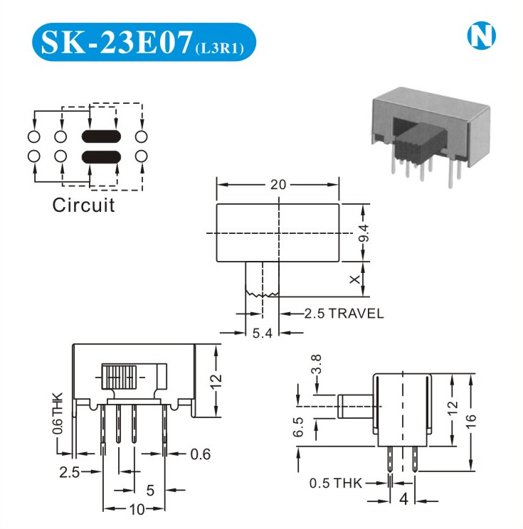 SK-23E07 詳細(xì)資料 產(chǎn)品說明: 技術(shù)指標(biāo): 使用溫度范圍 -20~+70℃ 耐壓 AC250V(50Hz)/min 額定負(fù)荷 DC 50V 0.5A 動(dòng)作力 250±100gf 接觸電阻 ≤0.05Ω 機(jī)械壽命 10000次 絕緣電阻 ≥100MΩ