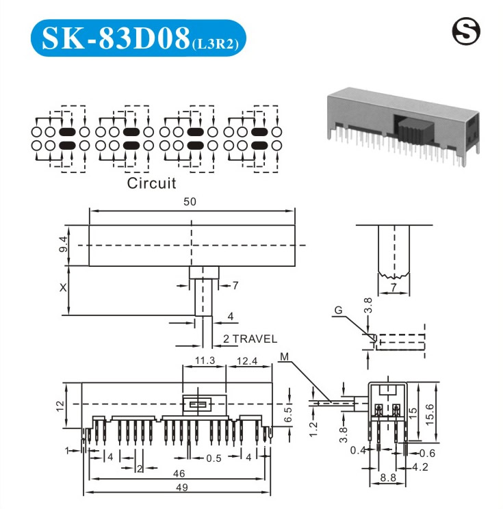 SK-83D08 詳細資料 產品說明: 技術指標: 使用溫度范圍 -20~+70℃ 耐壓 AC250V(50Hz)/min 額定負荷 DC 50V 0.5A 動作力 250±100gf 接觸電阻 ≤0.05Ω 機械壽命 10000次 絕緣電阻 ≥100MΩ