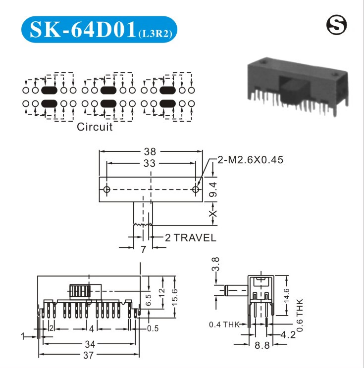 SK-64D01 詳細(xì)資料 產(chǎn)品說(shuō)明: 技術(shù)指標(biāo): 使用溫度范圍 -20~+70℃ 耐壓 AC250V(50Hz)/min 額定負(fù)荷 DC 50V 0.5A 動(dòng)作力 250±100gf 接觸電阻 ≤0.05Ω 機(jī)械壽命 10000次 絕緣電阻 ≥100MΩ