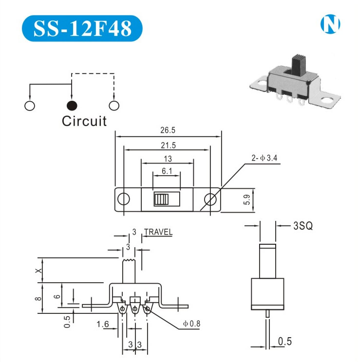 SS-12F48 詳細資料 產品說明: 技術指標: 使用溫度范圍 -20~+70℃ 耐壓 AC250V(50Hz)/min 額定負荷 DC 50V 0.5A 動作力 250±100gf 接觸電阻 ≤0.05Ω 機械壽命 10000次 絕緣電阻 ≥100MΩ
