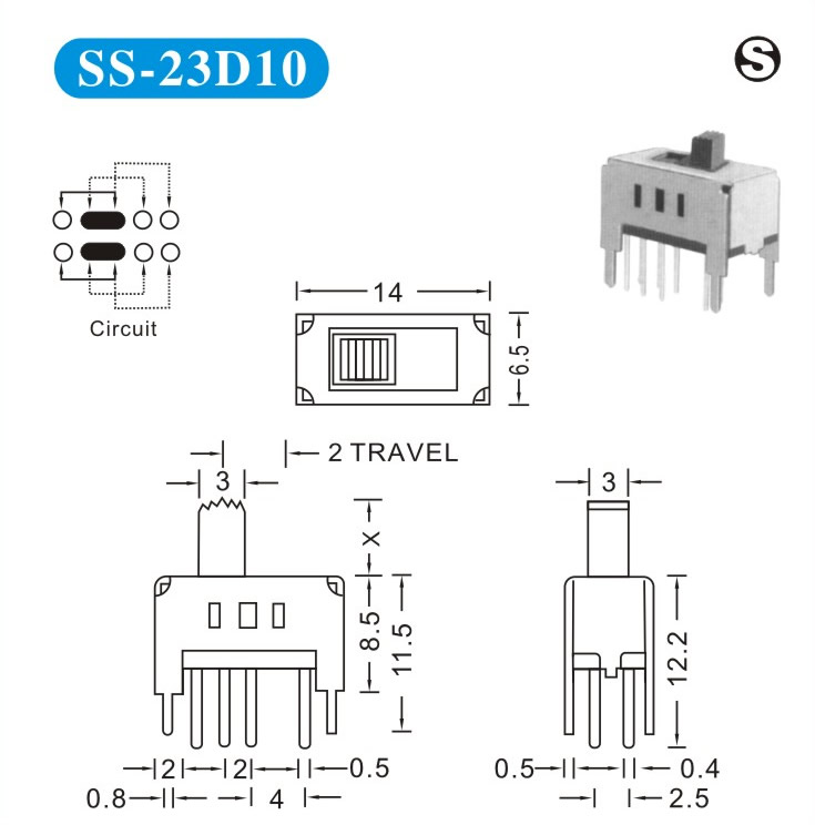 SS-23D10 詳細資料 產品說明: 技術指標: 使用溫度范圍 -20~+70℃ 耐壓 AC250V(50Hz)/min 額定負荷 DC 50V 0.5A 動作力 250±100gf 接觸電阻 ≤0.05Ω 機械壽命 10000次 絕緣電阻 ≥100MΩ