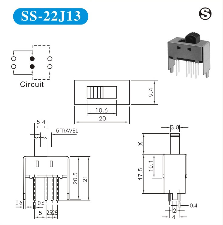 SS-22J13 詳細(xì)資料 產(chǎn)品說明: 技術(shù)指標(biāo): 使用溫度范圍 -20~+70℃ 耐壓 AC250V(50Hz)/min 額定負(fù)荷 DC 50V 0.5A 動(dòng)作力 250±100gf 接觸電阻 ≤0.05Ω 機(jī)械壽命 10000次 絕緣電阻 ≥100MΩ
