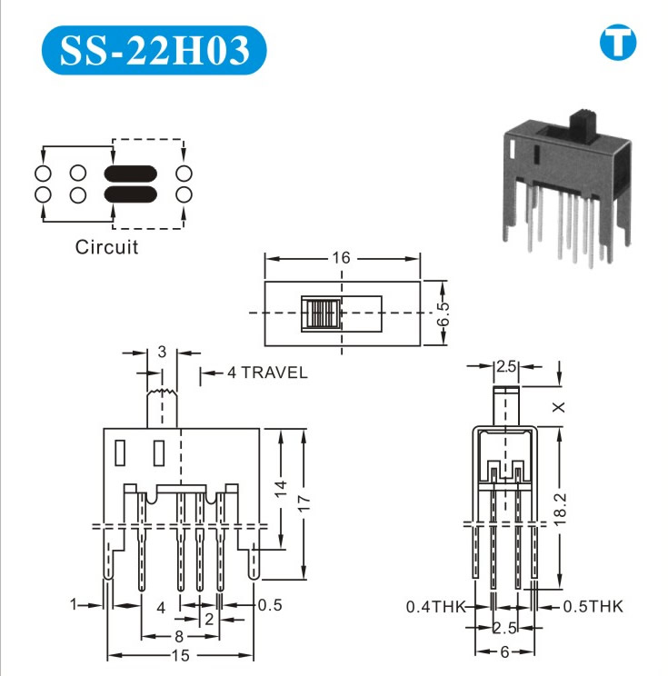 SS-22H03 詳細資料 產品說明: 技術指標: 使用溫度范圍 -20~+70℃ 耐壓 AC250V(50Hz)/min 額定負荷 DC 50V 0.5A 動作力 250±100gf 接觸電阻 ≤0.05Ω 機械壽命 10000次 絕緣電阻 ≥100MΩ