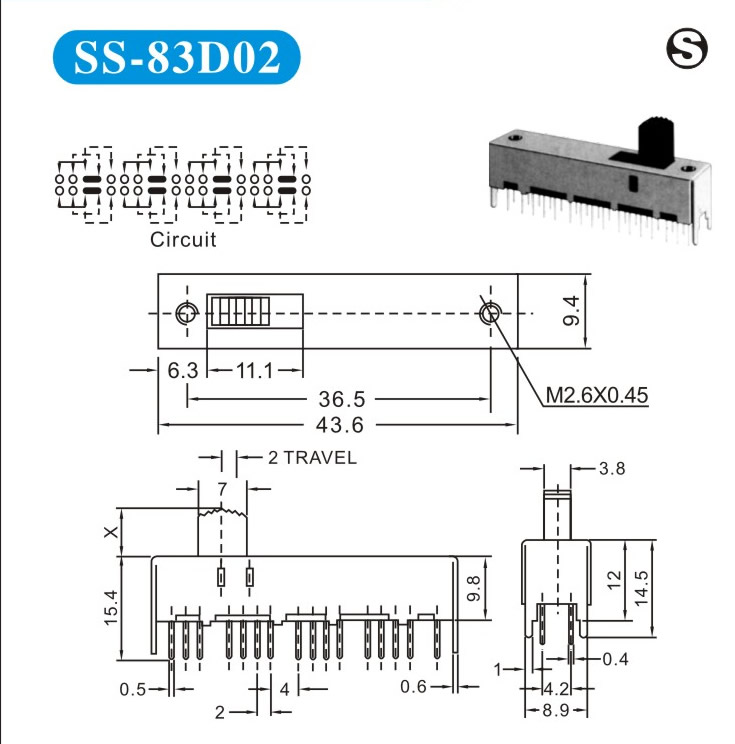 SS-83D02 詳細資料 產品說明: 技術指標: 使用溫度范圍 -20~+70℃ 耐壓 AC250V(50Hz)/min 額定負荷 DC 50V 0.5A 動作力 250±100gf 接觸電阻 ≤0.05Ω 機械壽命 10000次 絕緣電阻 ≥100MΩ