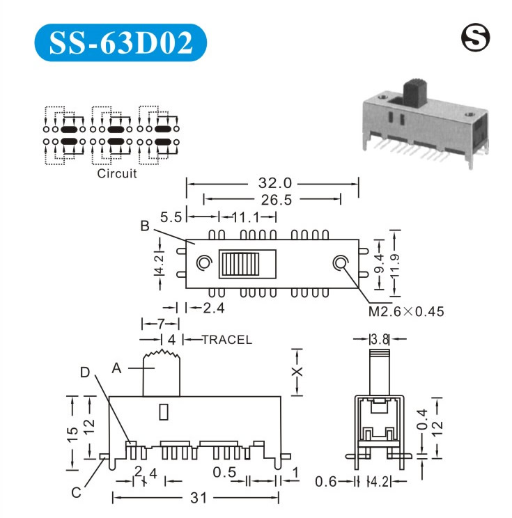 SS-63D02 詳細資料 產品說明: 技術指標: 使用溫度范圍 -20~+70℃ 耐壓 AC250V(50Hz)/min 額定負荷 DC 50V 0.5A 動作力 250±100gf 接觸電阻 ≤0.05Ω 機械壽命 10000次 絕緣電阻 ≥100MΩ